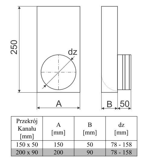 Kształtka 150 x 50 z wylotem fi 160 wentylacja DGP